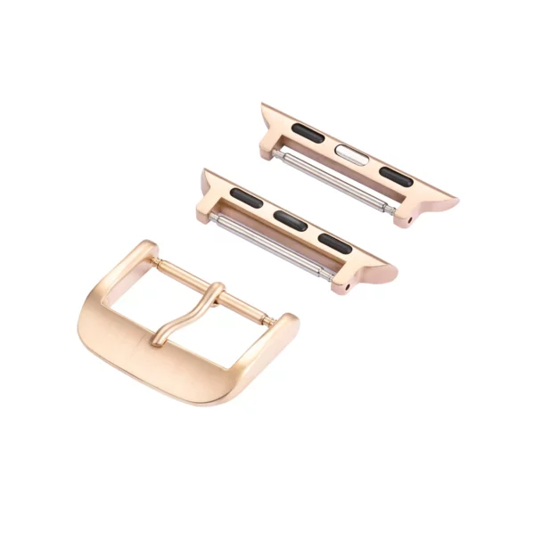 Inklusive passender Anschlüsse und Schließe in den Apple Watch Farben: Gold poliert, Roségold poliert, Schwarz, Silber gebürstet oder Silber poliert.