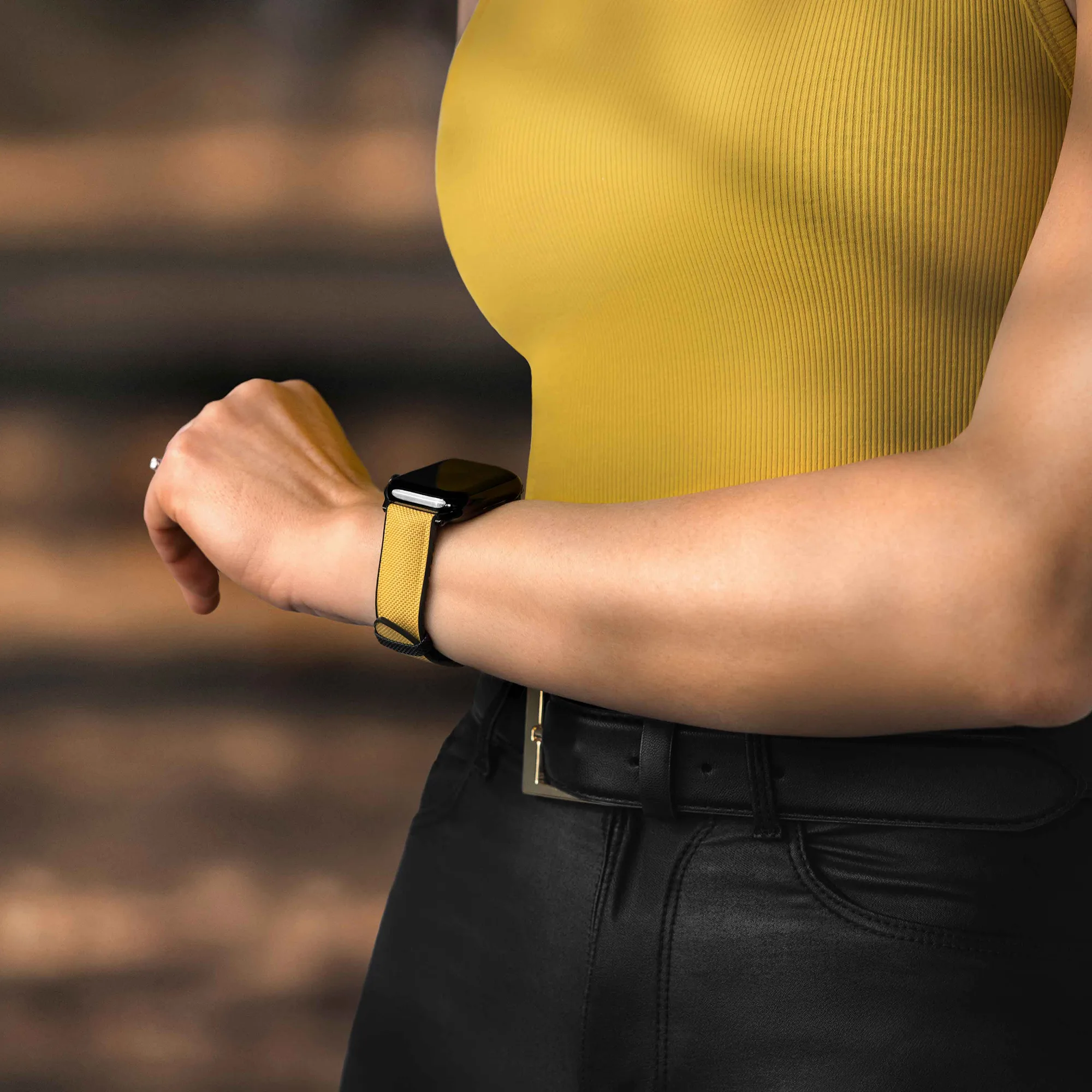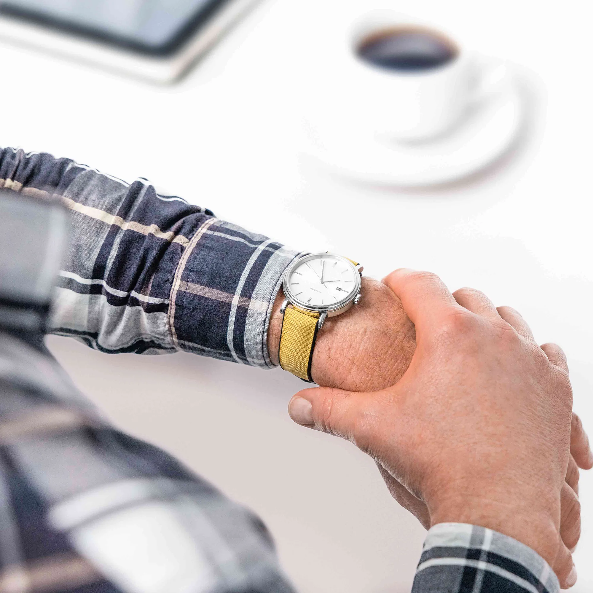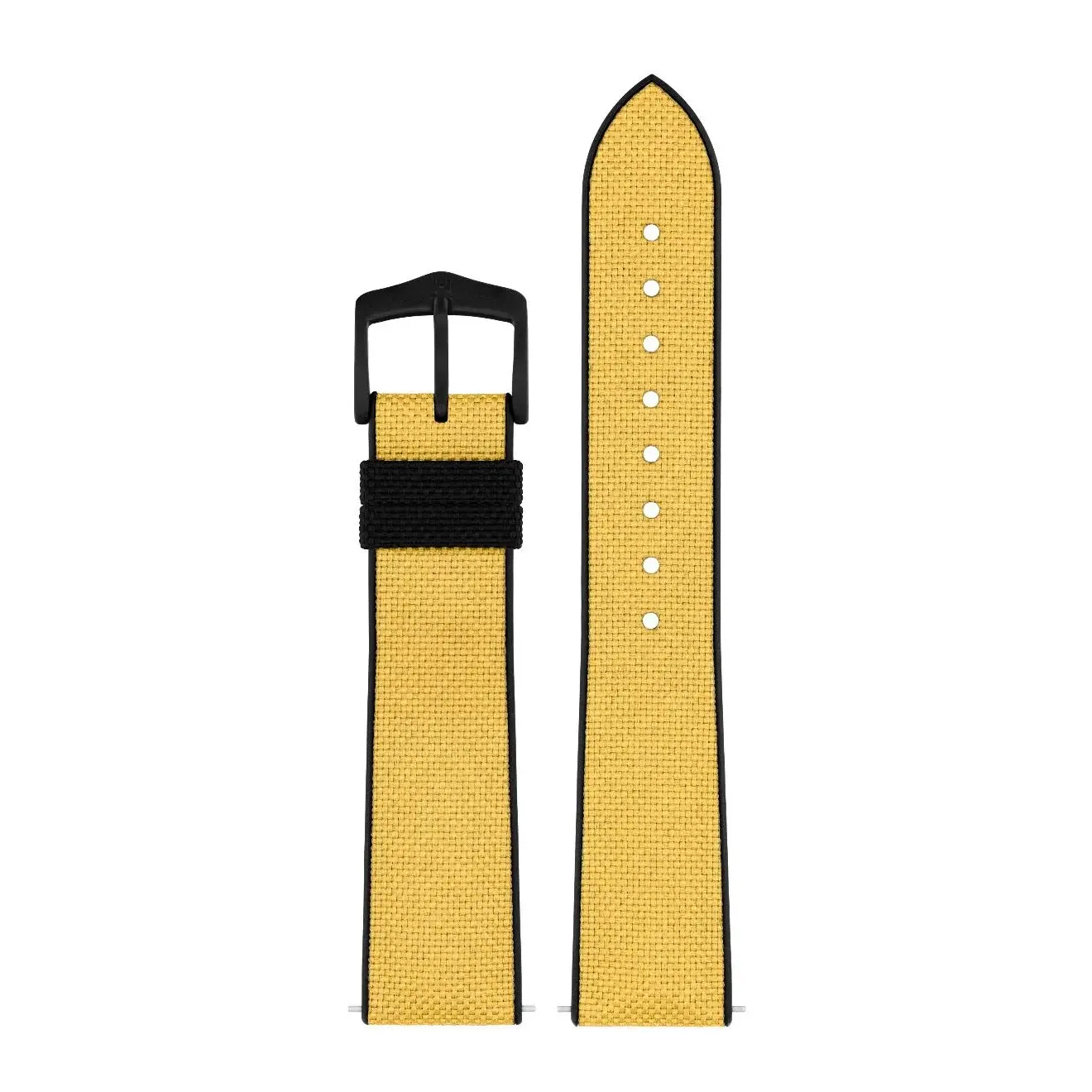 Uhrenarmband (Performance) in Gelb von HIRSCH. Dieses Ersatz-Armband wird aus Gummi und SEAQUAL® Marine Plastic hergestellt und ist in 9 Farben und 20 mm und 22 mm Stegbreiten verfügbar. Schließe: Schwarz gebürstet.