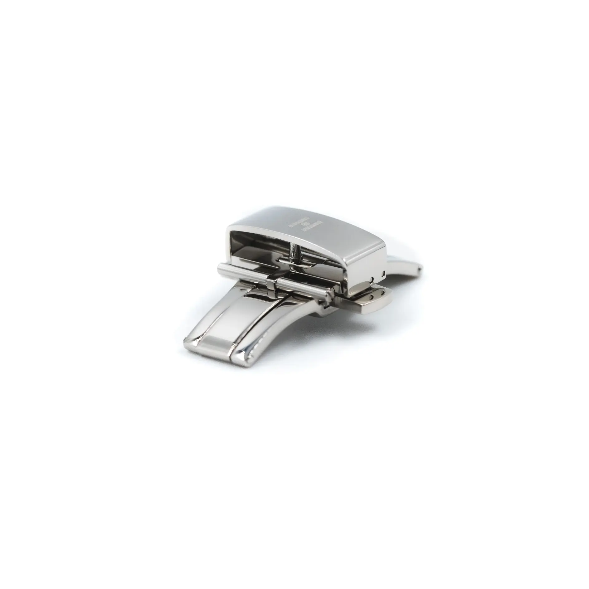 HIRSCH Doppelfaltschließe mit seitlichen Drückern aus hochglanzpoliertem Edelstahl in edler Silberoptik. Der integrierte Druckmechanismus ermöglicht ein müheloses Anlegen und garantiert gleichzeitig sicheren Halt. Entwickelt für höchsten Tragekomfort und passend zu vielen HIRSCH-Armbändern.