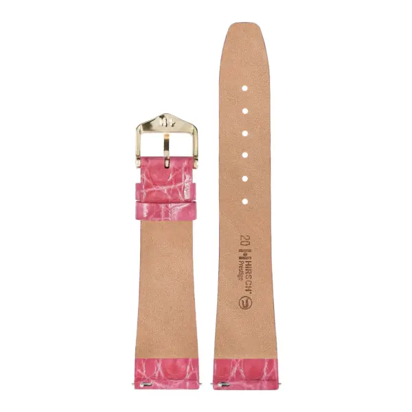 Uhrenarmband (Alligator, glänzend, Krokoprägung, von Hand glanzgestoßen) in Pink von HIRSCH. Dieses Wechsel-Armband wird aus Kalbsleder und Krokodilflanke (fasertief im Fass gefärbt) gefertigt und ist in 16 Farben und 9 Steg/Schließen-Breiten verfügbar. Schließe: Gold poliert, Roségold poliert oder Silber poliert.