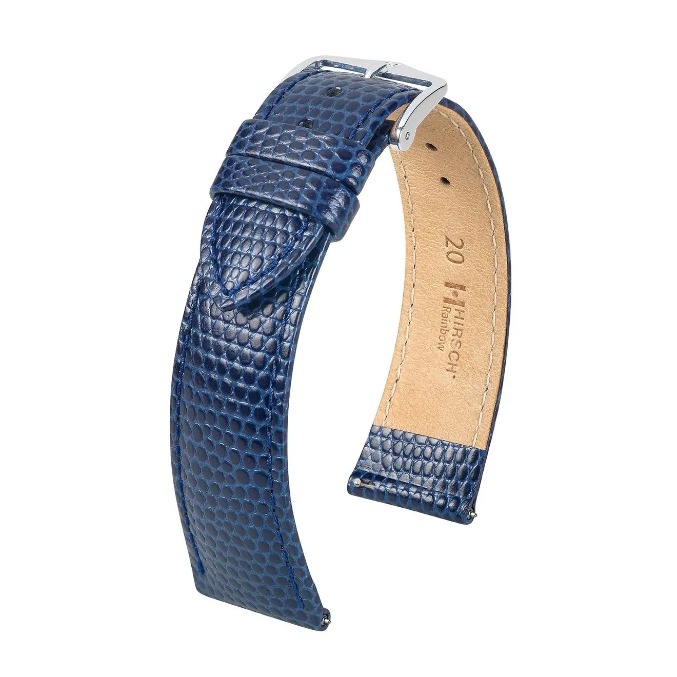 Uhrenarmband (Eidechse, Eidechsenprägung, semi-matt) in Blau von HIRSCH. Dieses Ersatz-Armband wird aus Kalbsleder hergestellt und ist in 8 Farben und 5 Stegbreiten verfügbar. Schließe: Silber poliert.