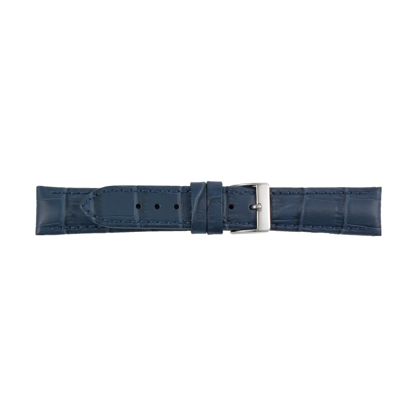 Uhrenarmband (Krokodil, Krokoprägung) in Blau von Pebro. Dieses Ersatz-Armband wird aus Kalbsleder hergestellt und ist in 8 Farben und 7 Stegbreiten verfügbar. Schließe: Silber.