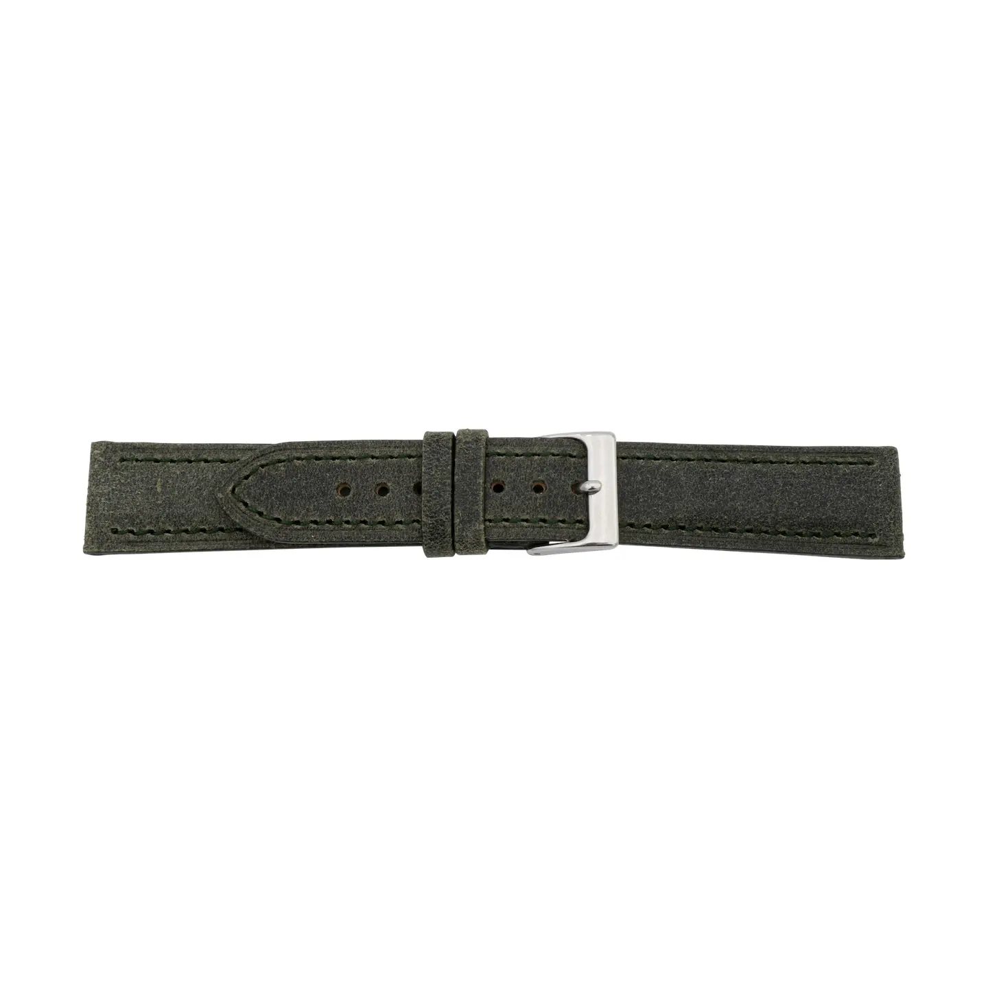 Uhrenarmband (Vintage, leichte Maserung) in Grün von Pebro. Dieses Ersatz-Armband wird aus Kalbsleder hergestellt und ist in 4 Farben und 4 Stegbreiten erhältlich. Schließe: Silber.