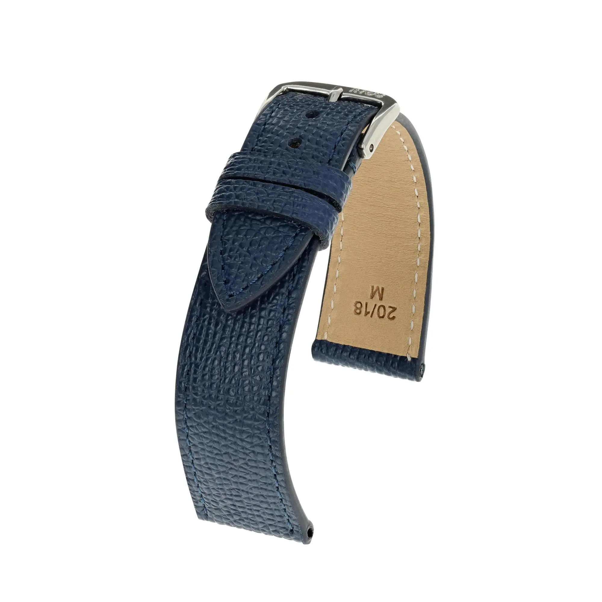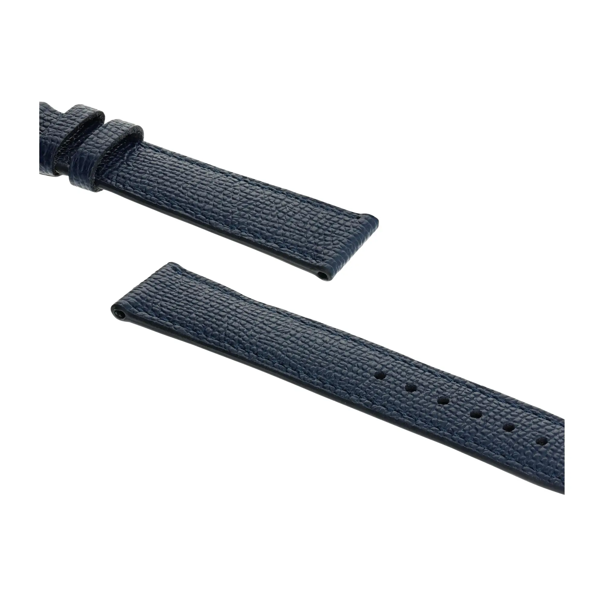 Uhrenarmband (Klassisch, strukturiert) in Blau von RIOS1931. Dieses Wechsel-Armband wird aus Rindsleder gefertigt und ist in 21 Farben und 6 Stegbreiten erhältlich. Schließe: Gold poliert oder Silber poliert.