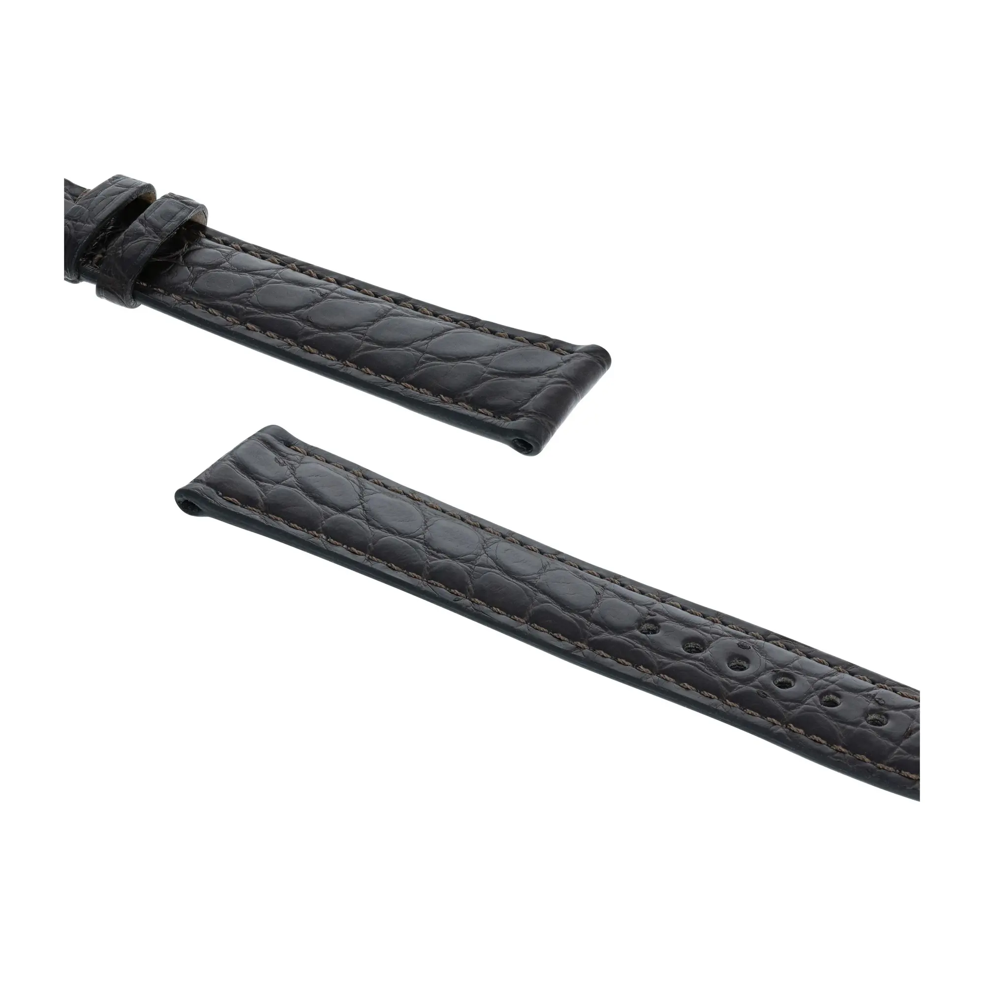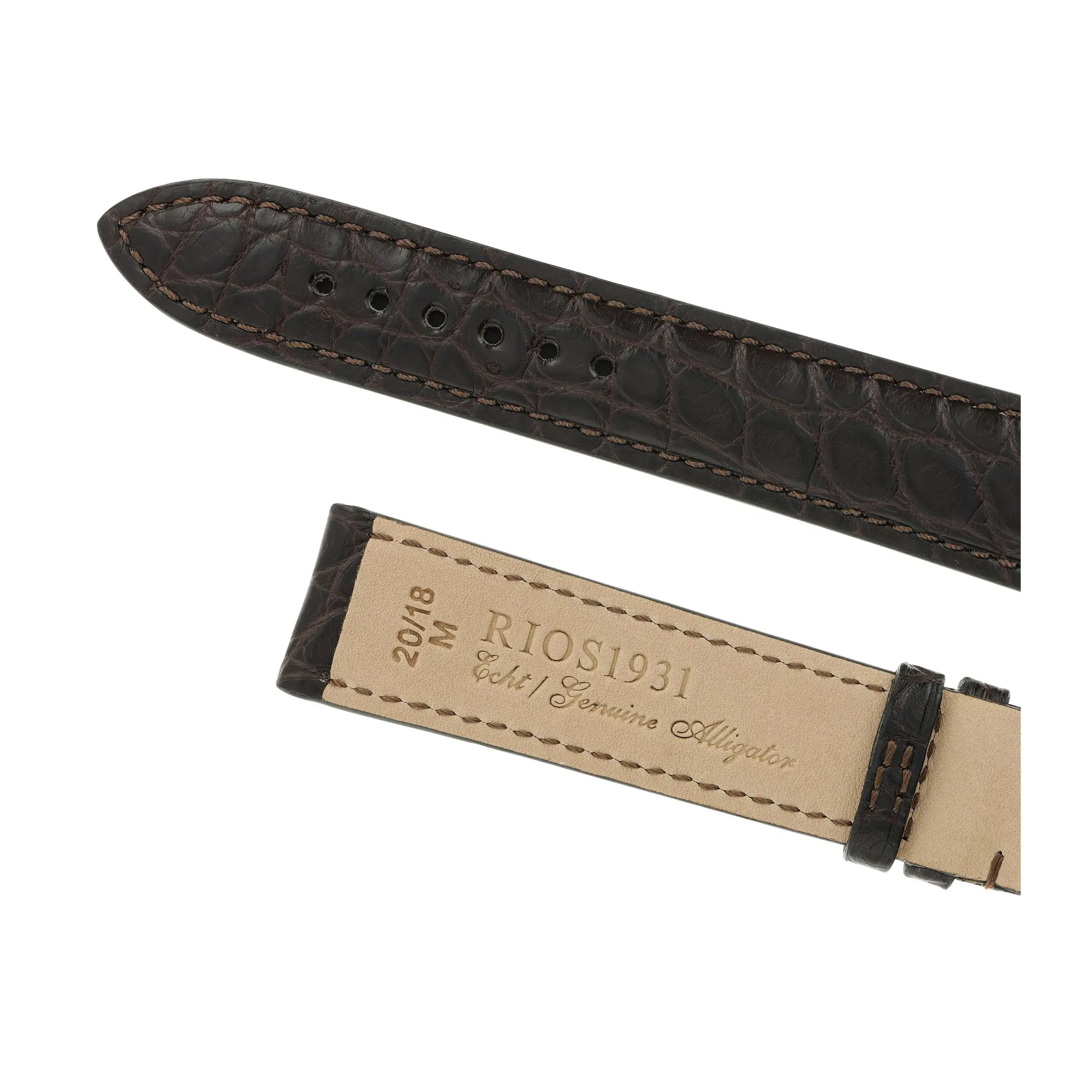 Uhrenarmband (Krokodil, Krokoprägung) in Braun von RIOS1931. Dieses Wechsel-Armband wird aus Alligatorleder gefertigt und ist in 5 Farben und 18 mm, 19 mm und 20 mm Stegbreiten erhältlich. Schließe: Gold poliert oder Silber poliert.