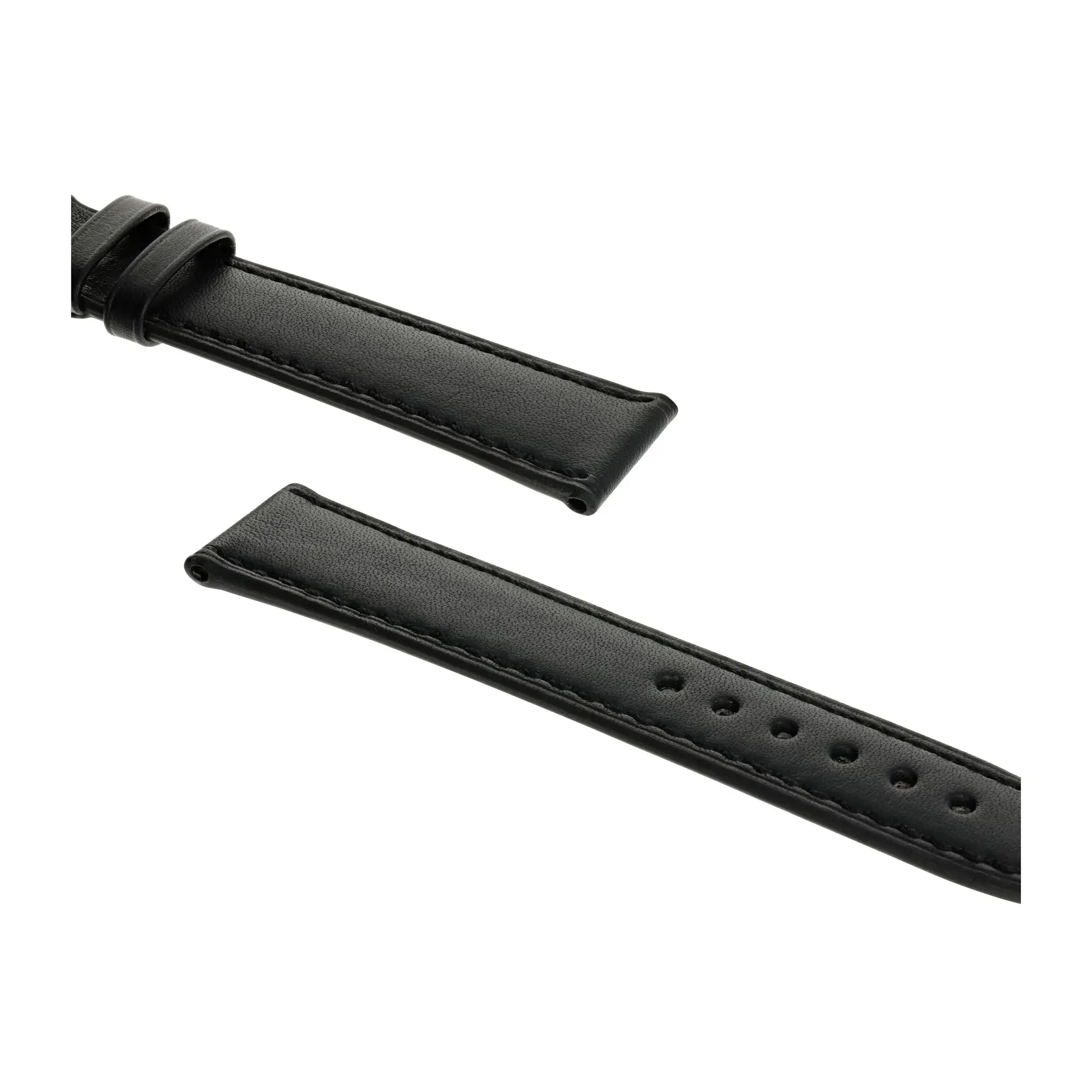 Uhrenarmband (Klassisch, glatt) in Schwarz von RIOS1931. Dieses Wechsel-Armband wird aus Rindsleder gefertigt und ist in 6 Farben und 18 mm, 19 mm und 20 mm Stegbreiten verfügbar. Schließe: Gold poliert oder Silber poliert.