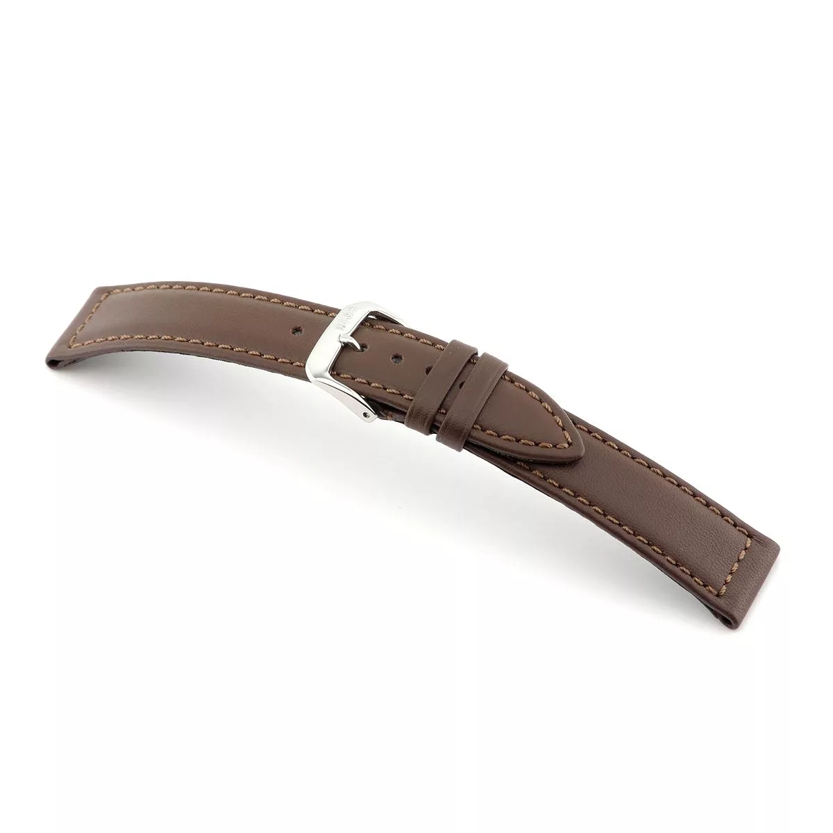 Uhrenarmband (Klassisch, glatt) in Braun von RIOS1931. Dieses Ersatz-Armband wird aus Rindsleder hergestellt und ist in 3 Farben und 18 mm, 20 mm und 22 mm Stegbreiten erhältlich. Schließe: Gold poliert oder Silber poliert.