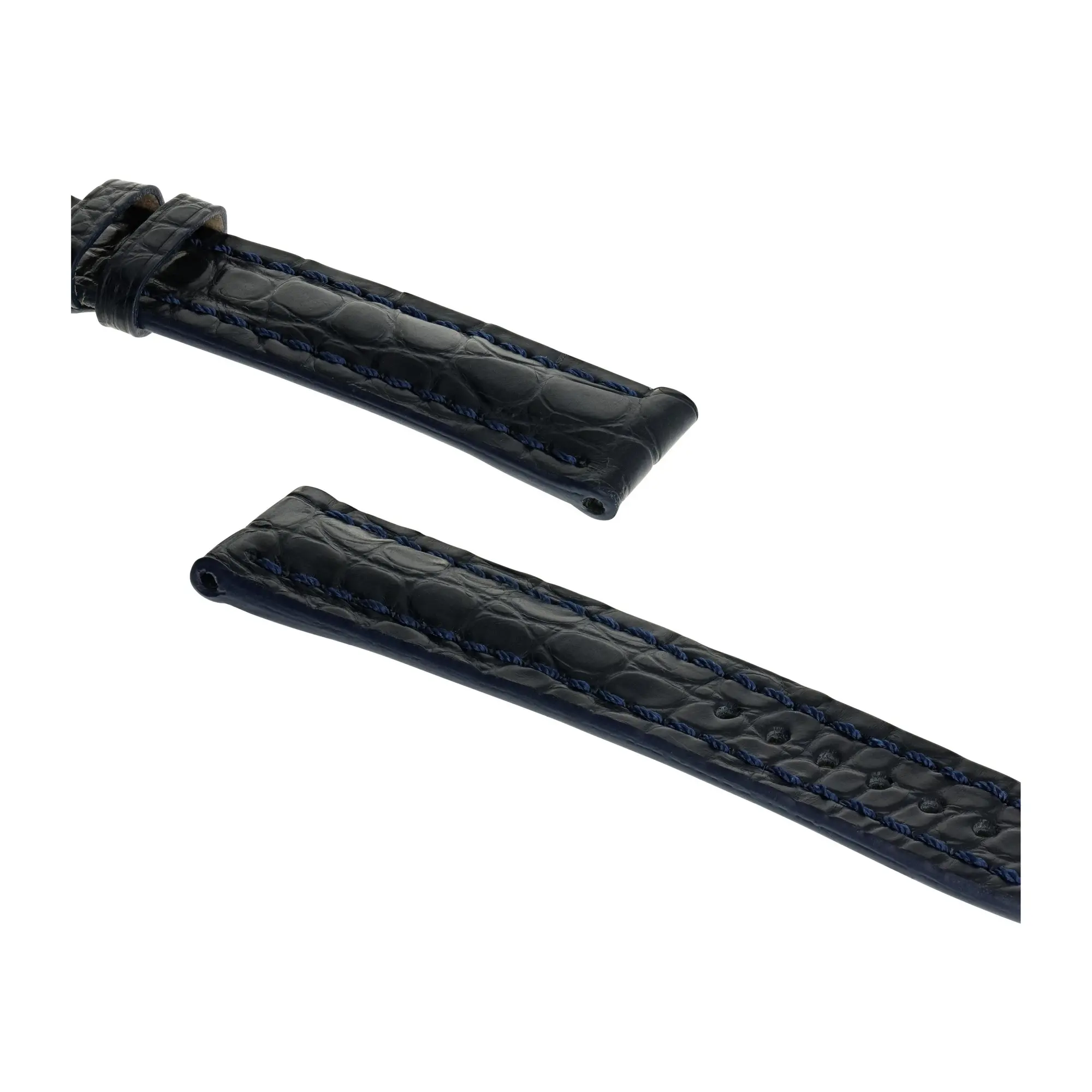 Uhrenarmband (Krokodil, Krokoprägung) in Blau von RIOS1931. Dieses Ersatz-Armband wird aus Alligatorleder hergestellt und ist in 5 Farben und 4 Stegbreiten erhältlich. Schließe: Gold poliert oder Silber poliert.